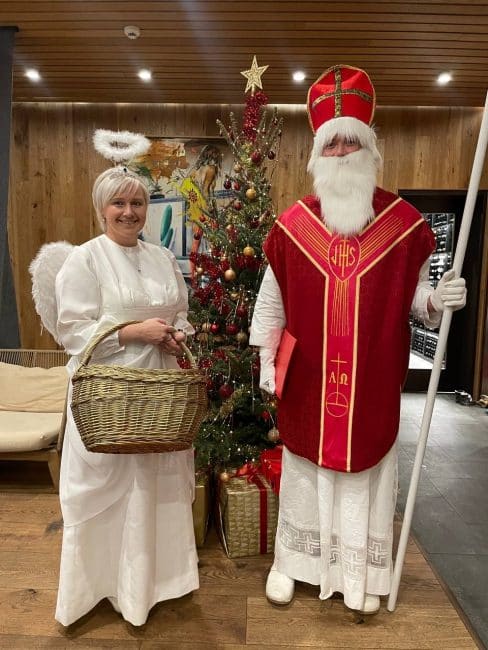 Dann öffnen sich die Türen und der Nikolaus mit dem Engel tritt in die Lobby des Aparthotels ein. Sie begrüßen die Kinder, hören sich ihre Gedichte und Lieder an und verteilen kleine Geschenke an jedes Kind.