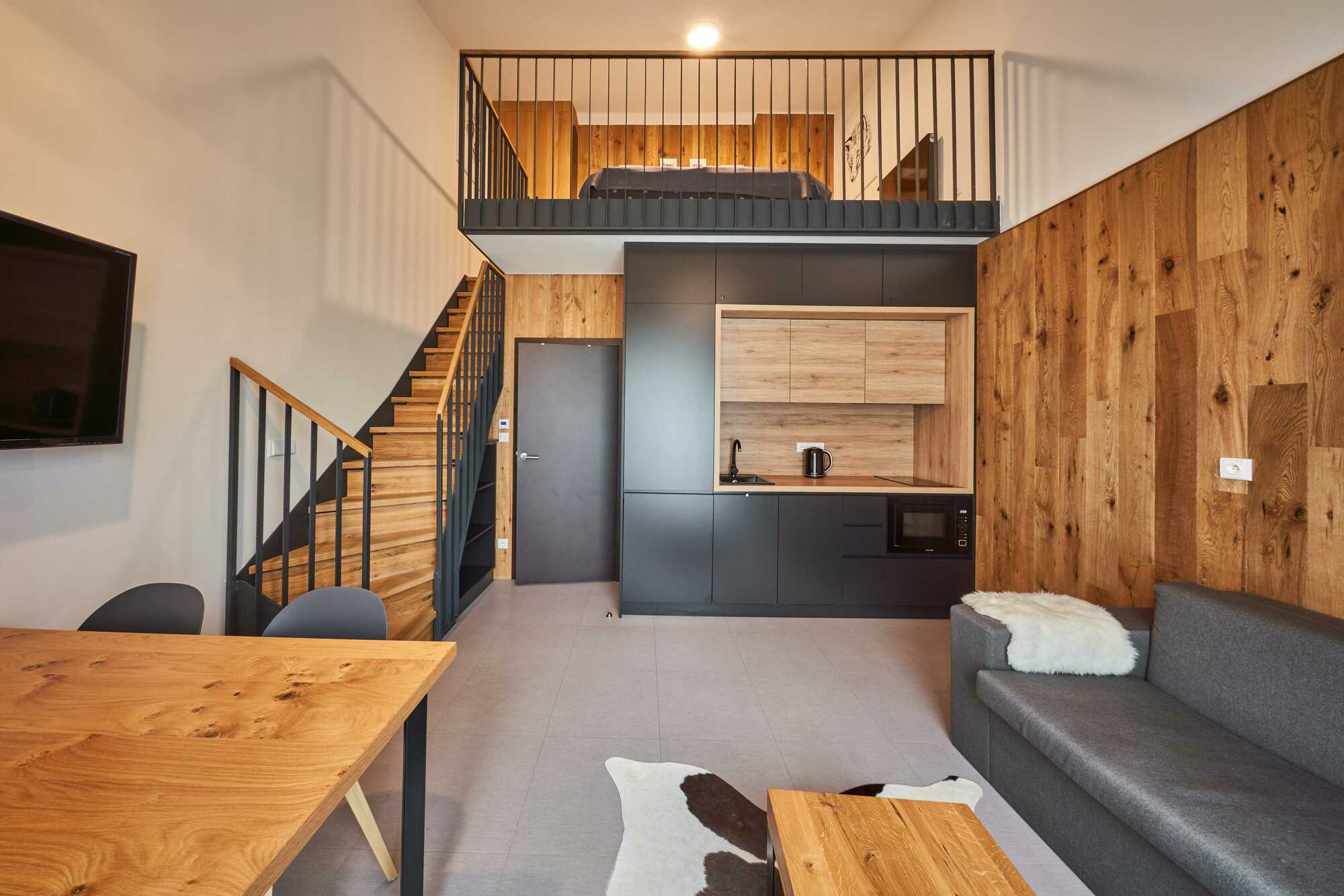 Studia z galerią oferuje zakwaterowanie dla 2 – 4 osób (łóżko podwójne lub wygodna rozkładana kanapa, rozkładane łóżko piętrowe lub rozkładany tapczan). Oferujemy więcej opcji. Tylko od Państwa zależy, jakiego wyboru dokonają.