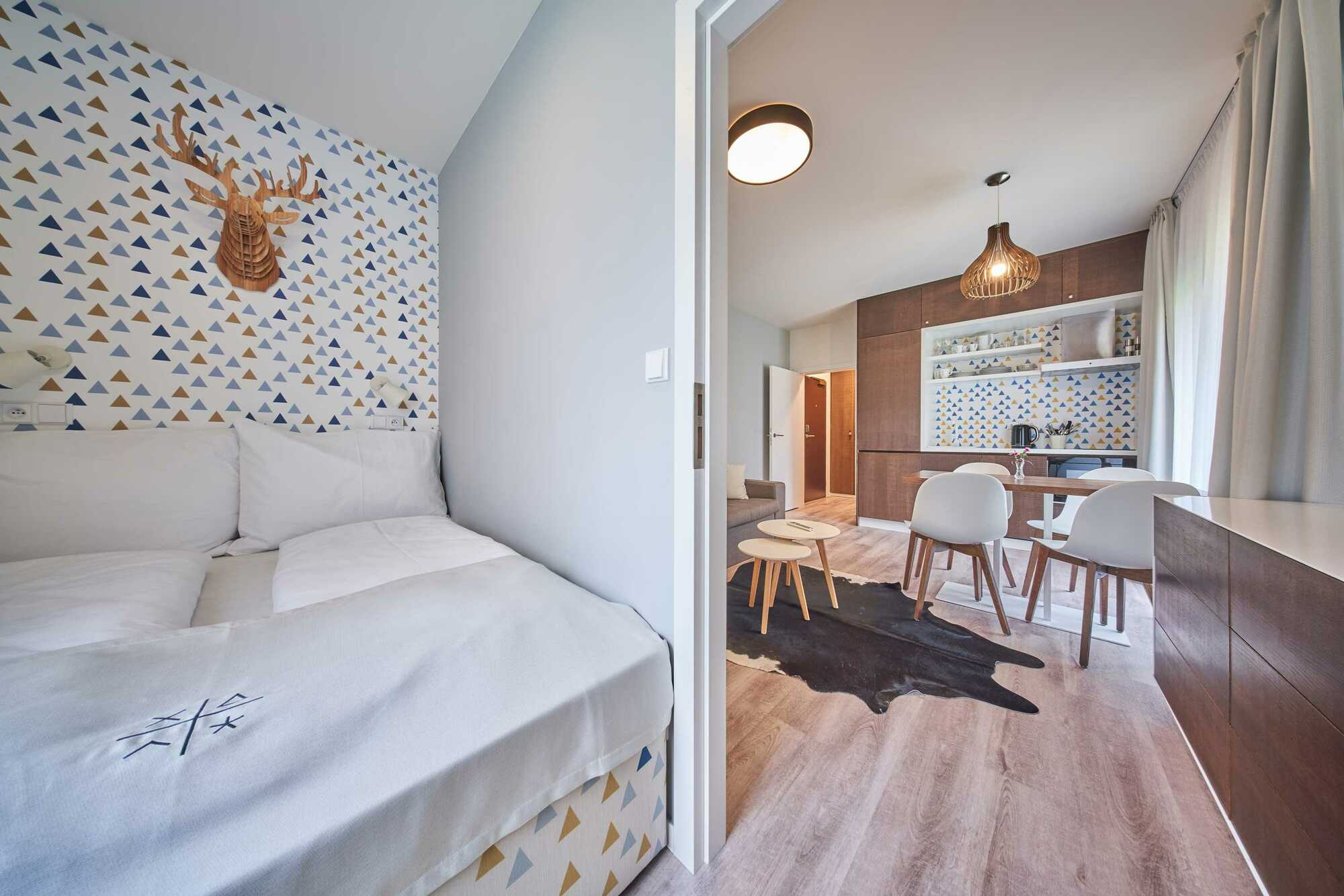 Apartamenty oferują zakwaterowanie dla 2 – 4 osób (łóżko podwójne lub wygodne rozkładana kanapa, rozkładane łóżko piętrowe lub rozkładany tapczan). Oferujemy więcej opcji. Tylko od Państwa zależy, jakiego wyboru dokonają.